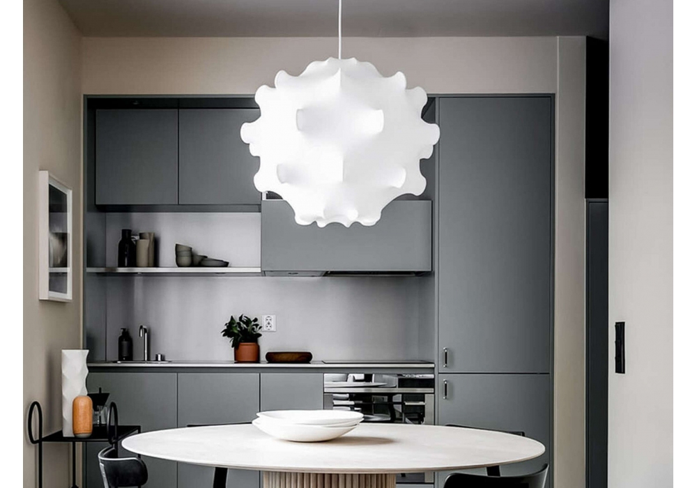 Taraxacum 1 designed by Achille & Pier Giacomo Castiglioni for Flos is a pendant lamp with diffused light. Internal structure in white powder-coated steel. Diffuser in "cocoon" resin sprayed on the structure, with transparent protection, sprayed at the end of the process. Remotely adjustable (dimmer not included). Bulb not included.
