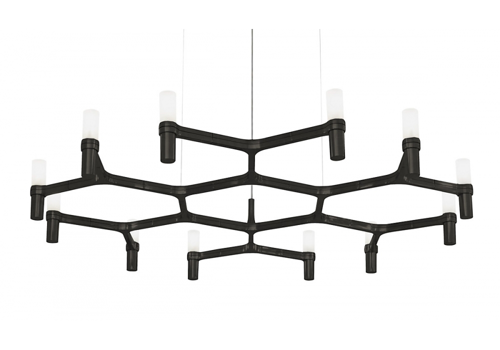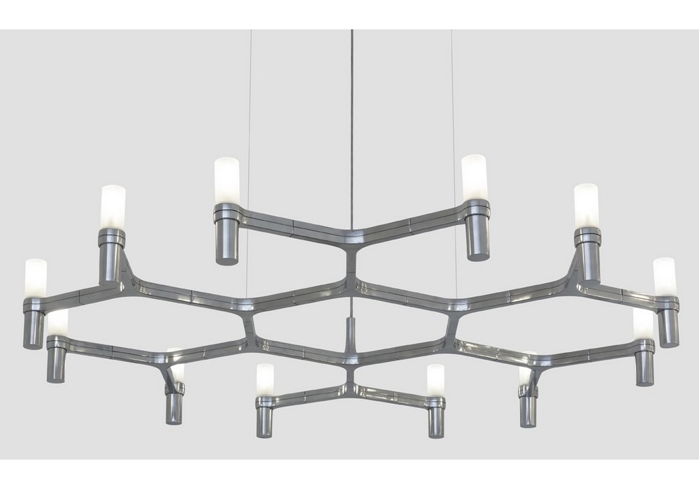 Crown Plana Minor designed by Jehs + Laub for Nemo is a modular chandelier with die-cast aluminum structure and sandblasted glass diffusers. As a light source, LED or halogen is used. Crown Plana Minor is available in different finishes.