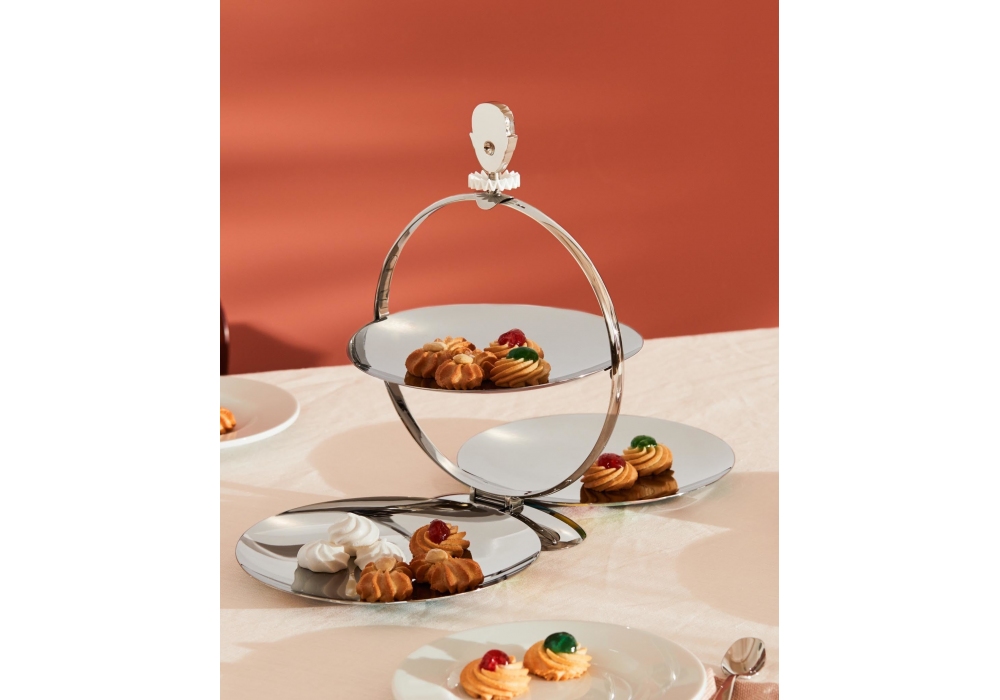 Fatman designed by Marcel Wanders for Alessi is a decorated folding cake stand made of 18/10 stainless steel.