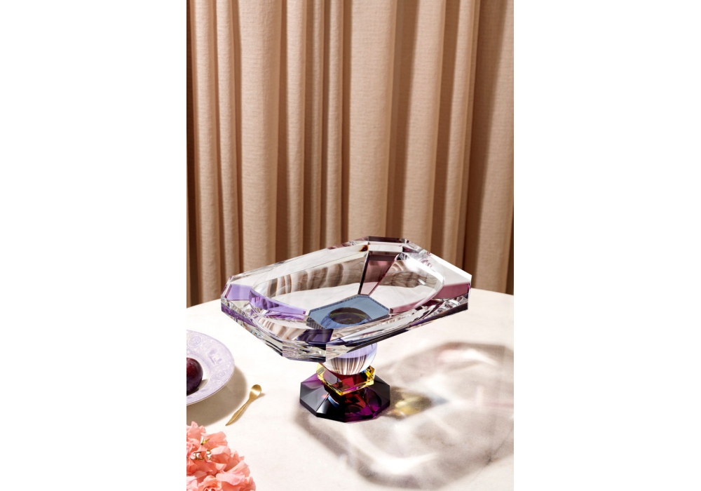 Georgia produced and signed by Reflections Copenhagen is a crystal centerpiece structured by various geometric elements carved and finished by hand in transparent, blue, mixed purple, transparent and yellow.