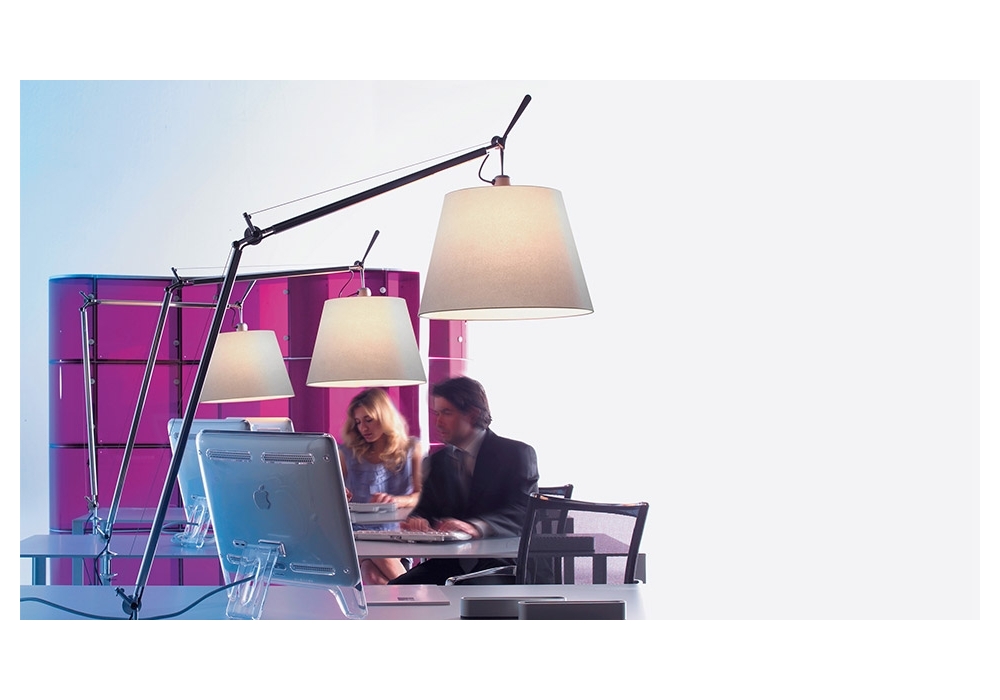 Tolomeo Mega designed by Michele De Lucchi & Giancarlo Fassina for Artemide is a table lamp entirely made of painted or natural aluminium. The structure is equipped with movable arms with joints and polished aluminum supports. The lampshade is circular in shape and can be chosen in satin, fabric or parchment and adopts an LED light source with or without a dimmable system. Tolomeo Mega is available in different finishes in the clamp or fixed pin version.