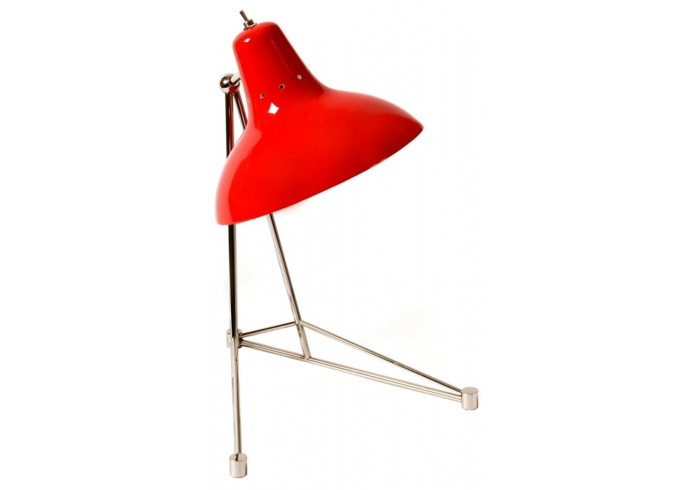 Diana designed by DelightFULL is a handmade table lamp built with materials such as brass and aluminum. Brass was used for the body, while aluminum was chosen for the lampshade. The aluminum shade is lacquered in glossy red on the outside and matt white on the inside, while a nickel-plated finish has been chosen for the body.