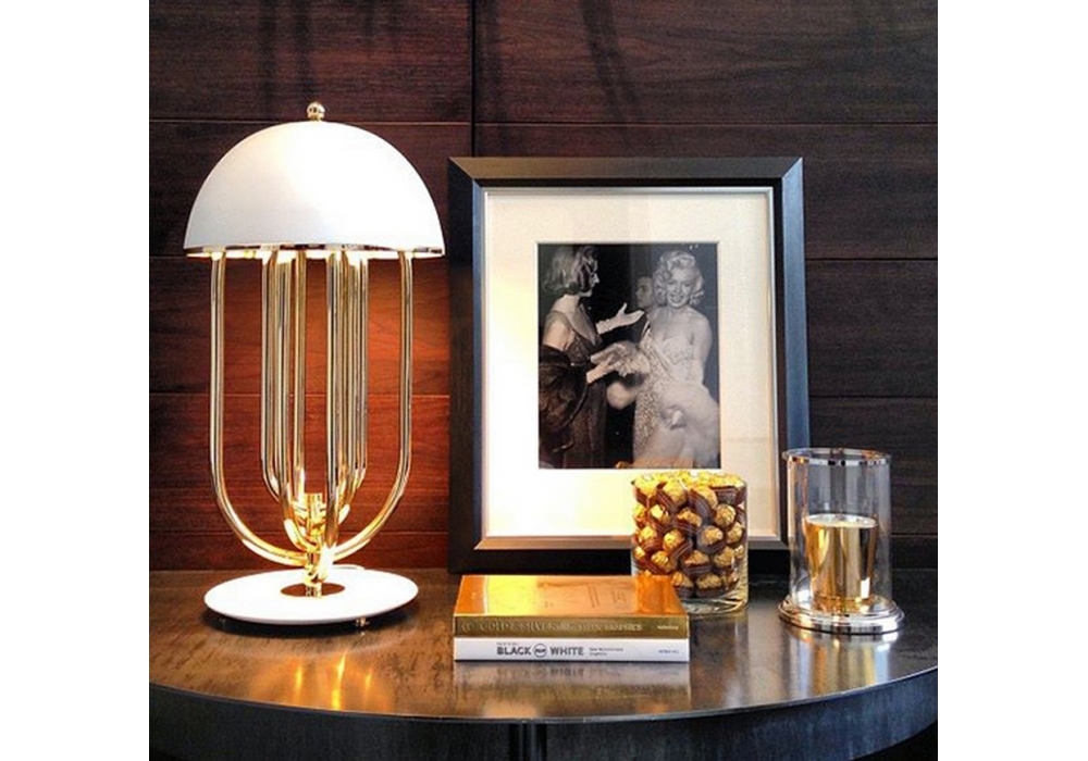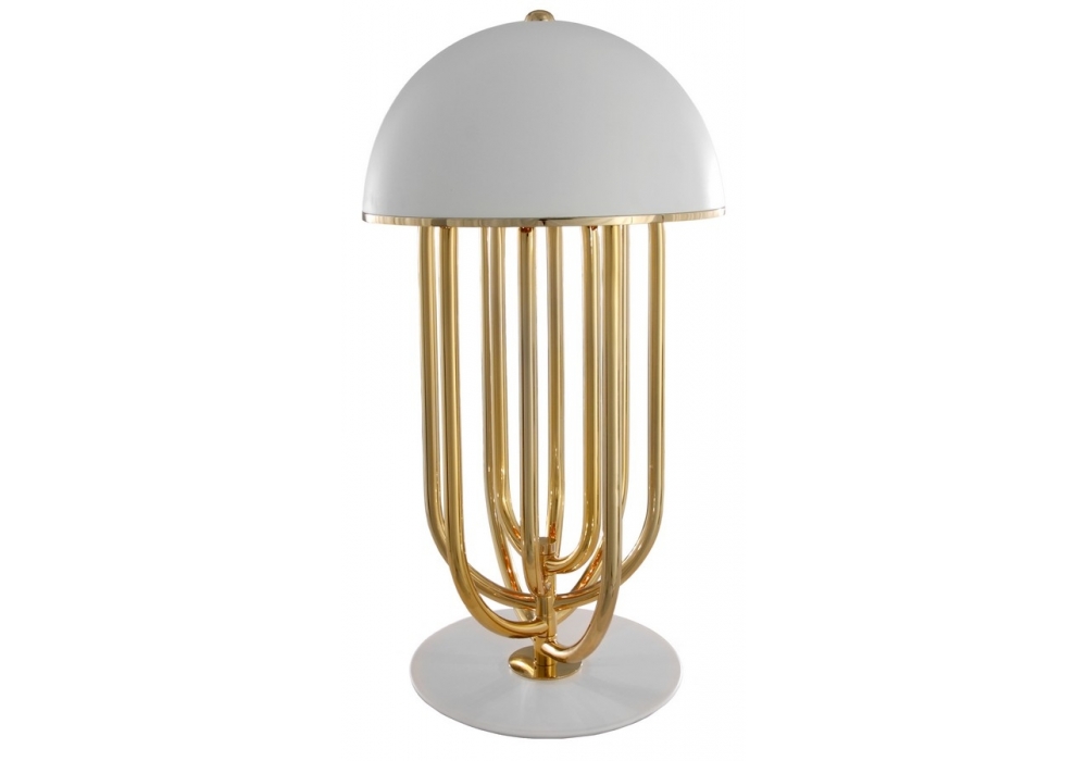Turner designed by DelightFULL is a table lamp, it has an art deco shape with the possibility of rotating the arcs in the desired position, in order to create the perfect composition for any environment. The arches are made of brass with a gold trim and the top cover of white painted aluminum.