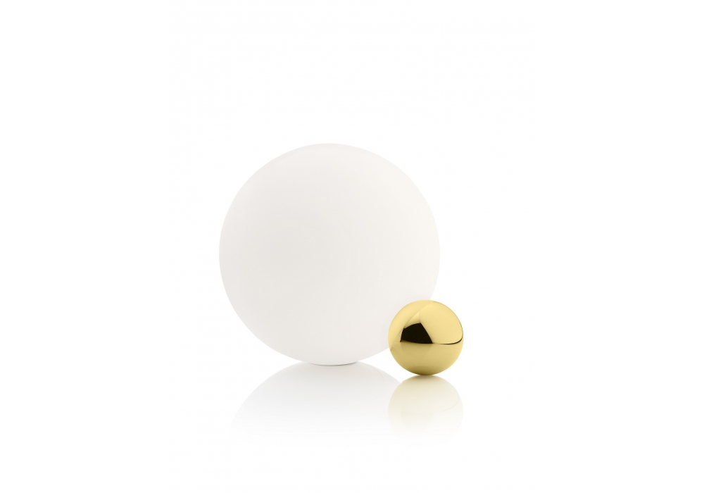 Copycat designed by Michael Anastassiades for Flos is a table lamp composed of a sphere of aluminum machined from solid and then gilded with a 24 K gold bath. Opal diffuser in blown glass. LED light source with dimmer switch along the power cable.