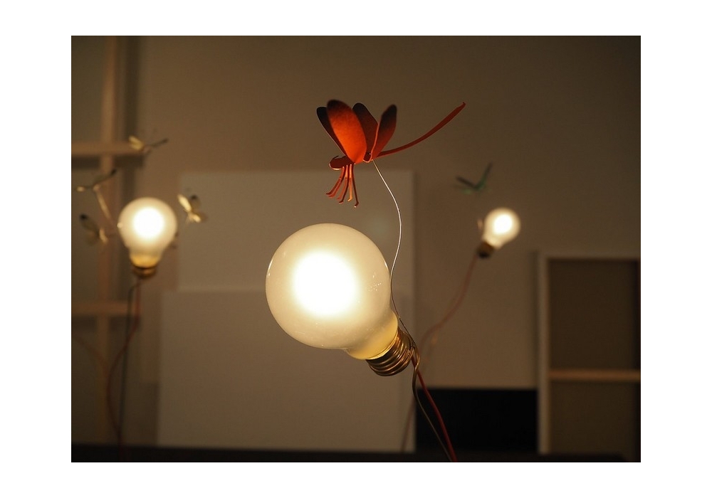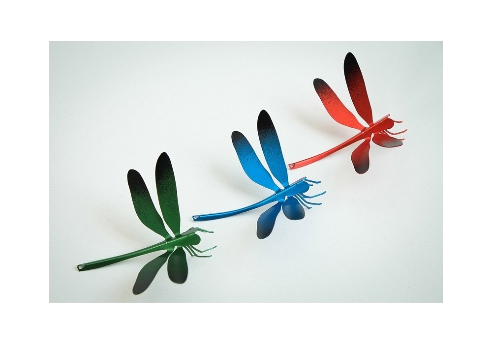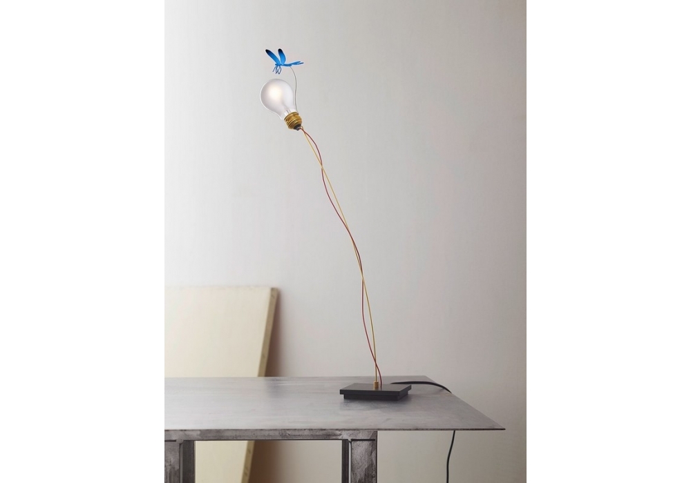 I Ricchi Poveri Bzzzz designed and produced by Ingo Maurer is a table lamp with a dragonfly-shaped application, made of anodized aluminum in 3 different finishes. The structure is in steel and brass.