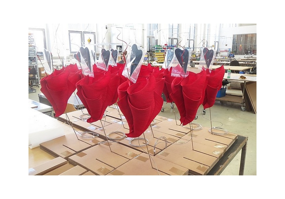 Kokoro designed by Dagmar Mombach for Ingo Maurer is a table LED lamp, with structure in metal and stainless steel, diffuser in red paper and details in glass and synthetic material. Adjustable mirror.