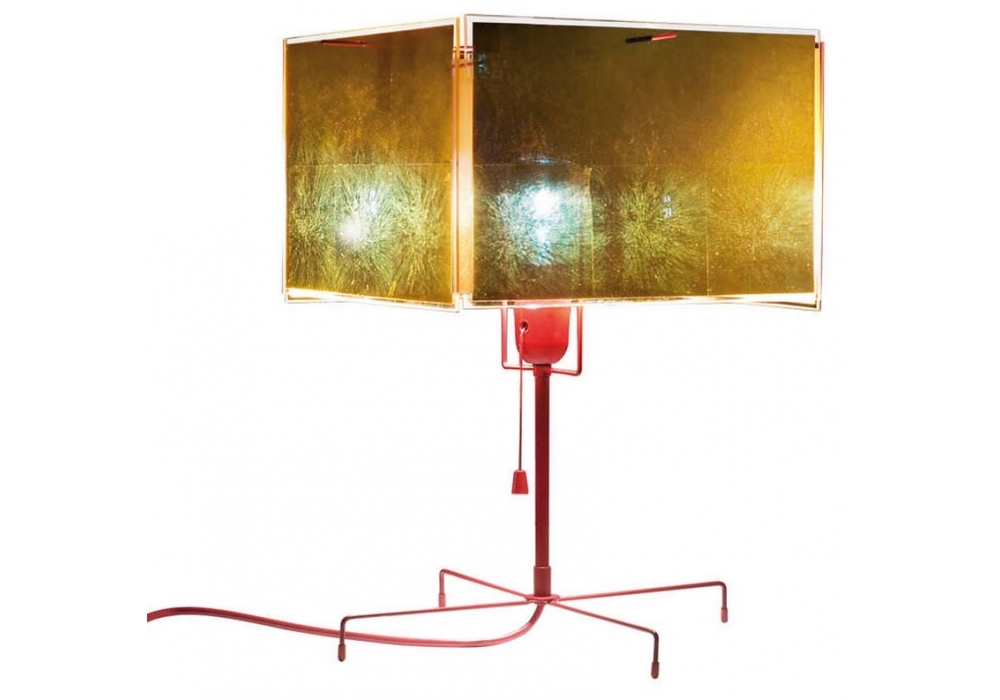 24 Karat Blau T designed by Alex Schmid for Ingo Maurer is a table lamp with metal structure, diffuser made with 4 laminated gold leaf lampshades, which can be hung on the cross rod in various angles and positions.