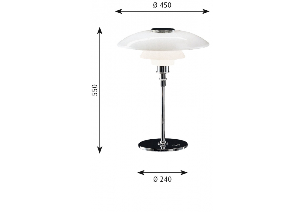 PH 4½-3½ Glass designed by Poul Henningsen for Louis Poulsen is a table lamp with circular base in pulled brass, steel stem and fully chromed brass top plate. The diffuser is in white opal glass and shields a LED or halogen light source with E27 fitting.