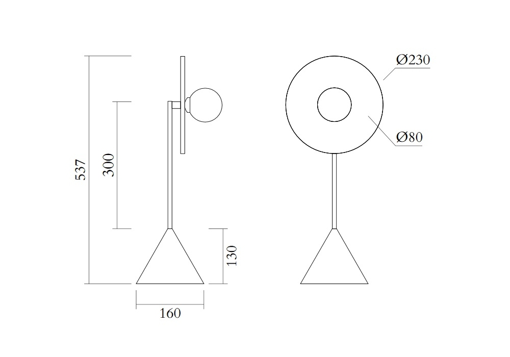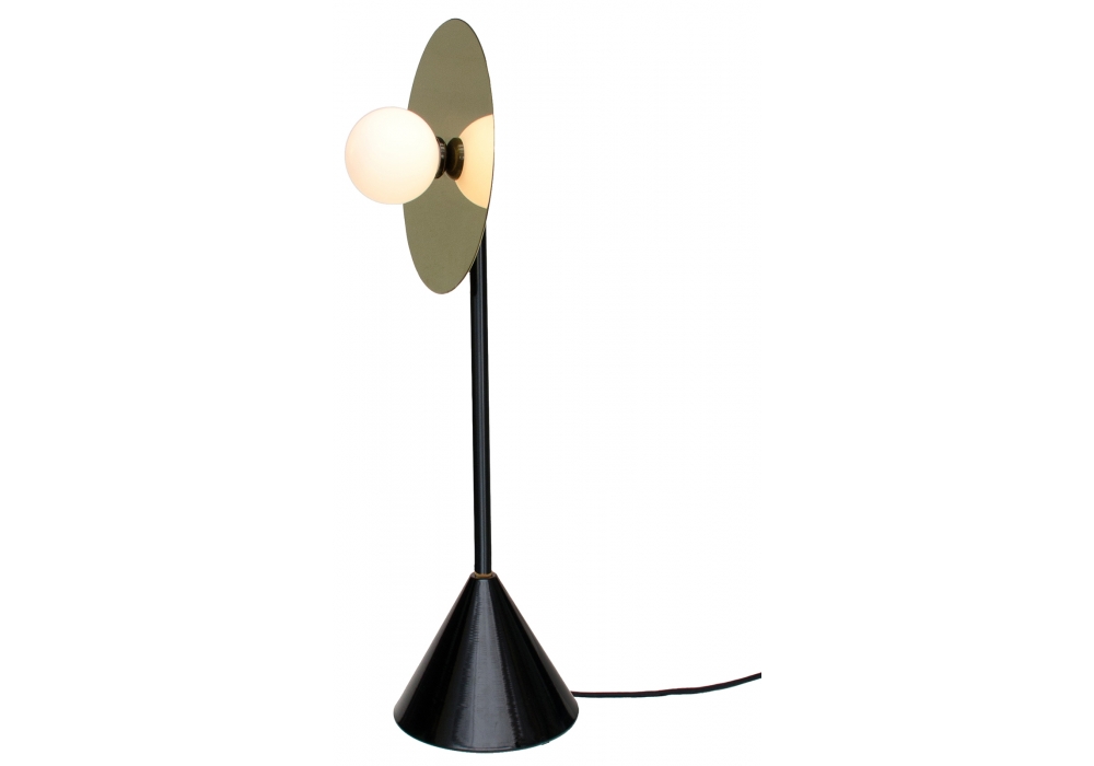 Disk and Sphere designed by Atelier Areti is a table lamp with structure made of powder-coated metal and glass sphere resting on a polished or chromed brass disc. Bulb not included.