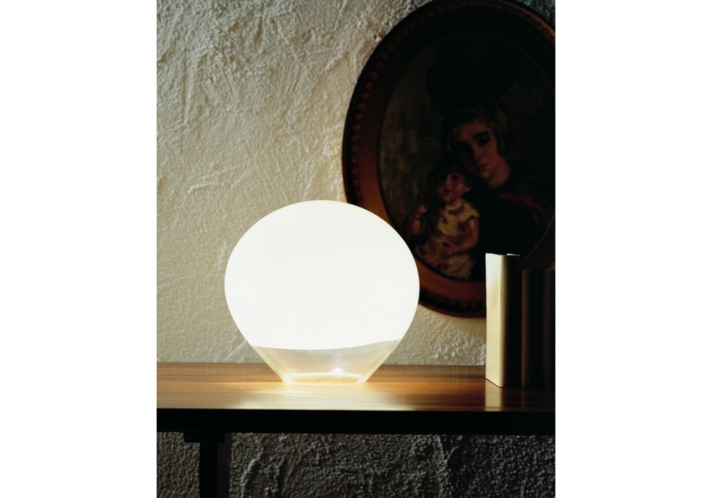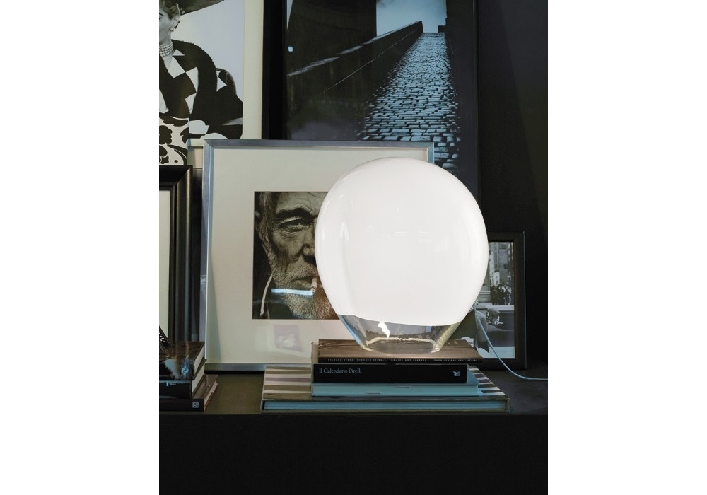 Nessa produced and designed by Vistosi is a rounded table lamp entirely made of blown glass. The lower part is transparent while the upper part is white and shields a LED or halogen type light source with E27 fitting with on/off switch on the power cable.