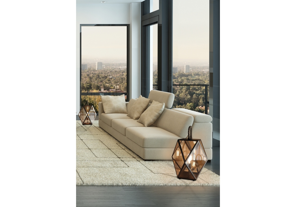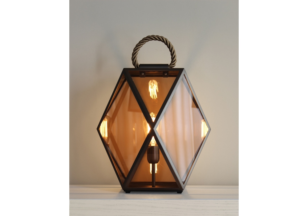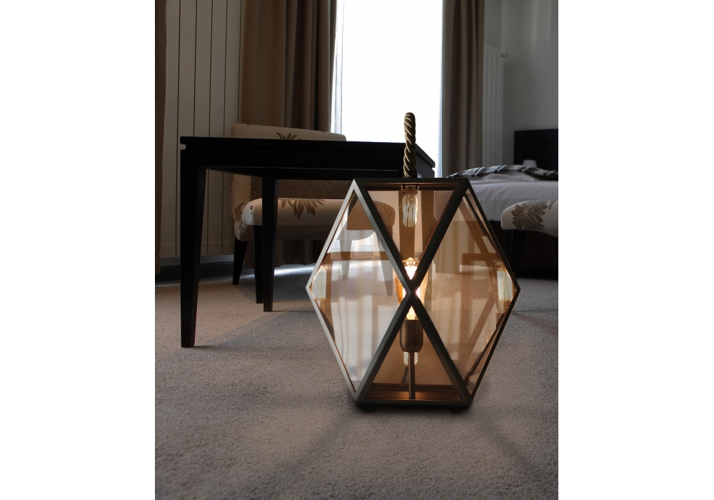 Muse Lantern designed by Tristan Auer for Contardi is a table or floor lamp with supporting structure in brushed bronze. The diffuser is made of amber-coloured acrylic and shields a dimmable LED light source. The power cable is in black fabric with on/off switch or dimmer pedal and practical honey-colored woven silk handle. Muse Lantern is available in different sizes and versions.