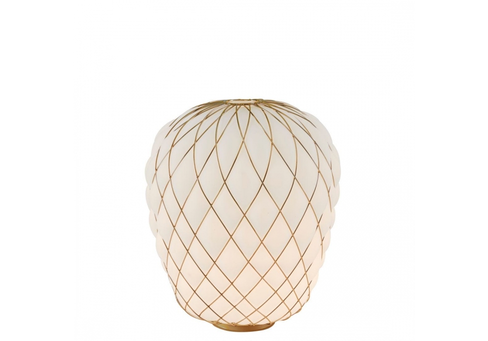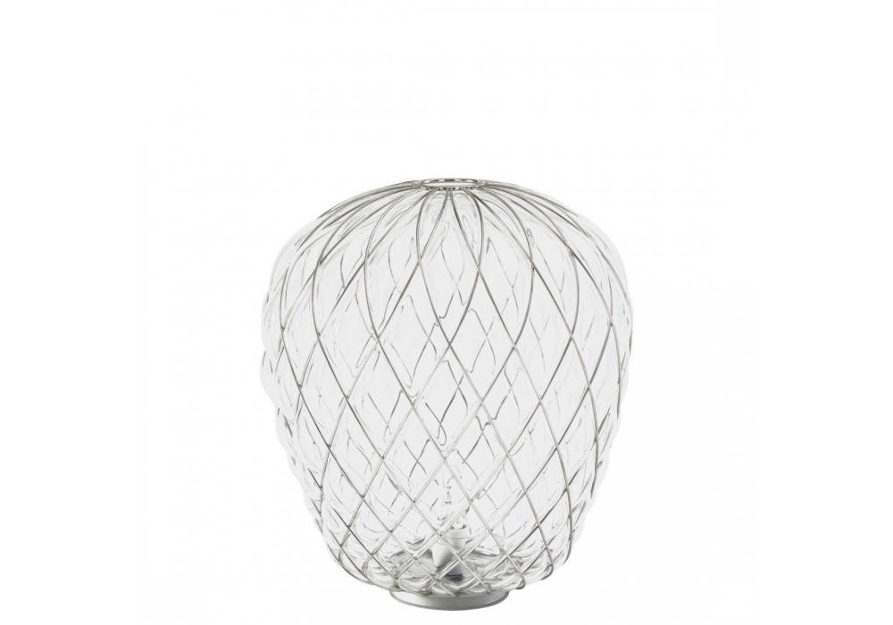 Pinecone designed by Paola Navone for Fontana Arte is a table lamp with transparent blown glass or milky white acid-etched diffuser. Chrome-plated or gold-plated metal cage. Transparent dimmer, plug and power cord. Also available in 2 sizes.