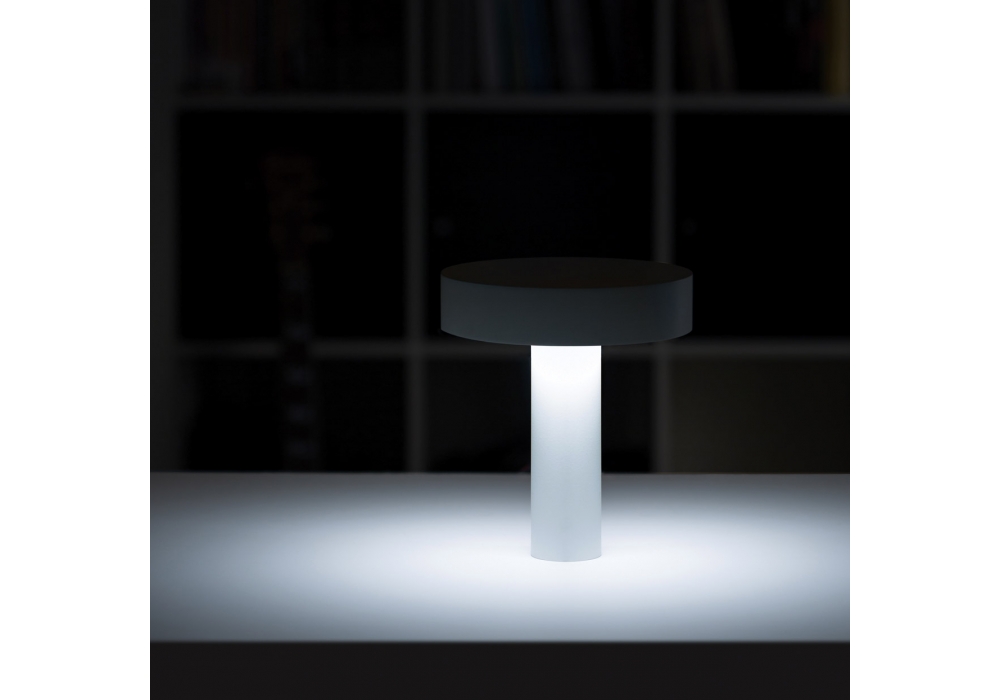 PoPuP designed and produced by Davide Groppi is a table lamp with audio diffuser and magnetic circular base. The supporting structure is in metal while the diffuser is in methacrylate and shields a LED-type light source with on/off switch.
