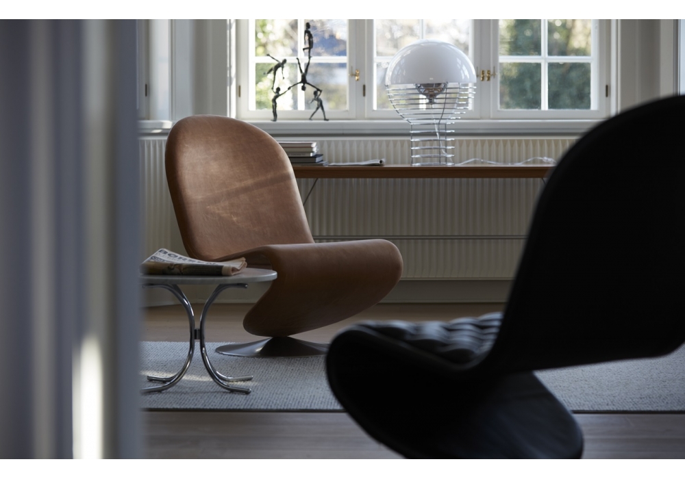 Wire designed by Verner Panton for Verpan is a table lamp with a cylindrical metal wire structure that widens into a hemisphere at the top. Hemispherical lampshade in white or orange plastic. There is a transparent on/off switch on the power cable.