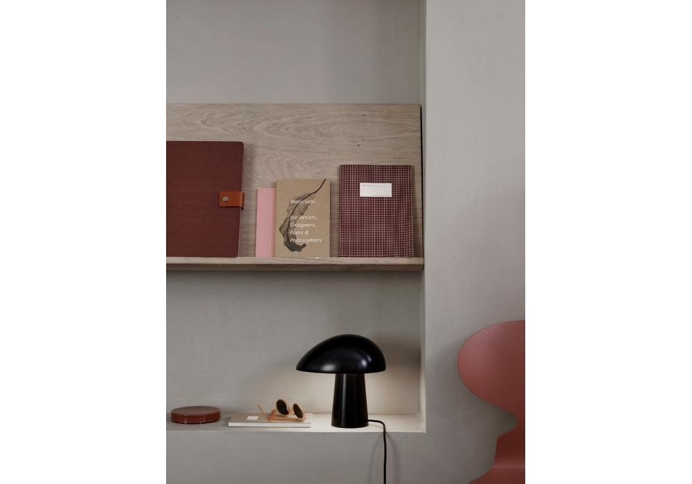 Night Owl designed by Nikolaj Wiig Hansen for Fritz hansen is a table lamp consisting of a conical base and an oval lampshade. The matt lacquered aluminum lampshade is completed by a natural ash base or an aluminum base with a color matching the lampshade.
