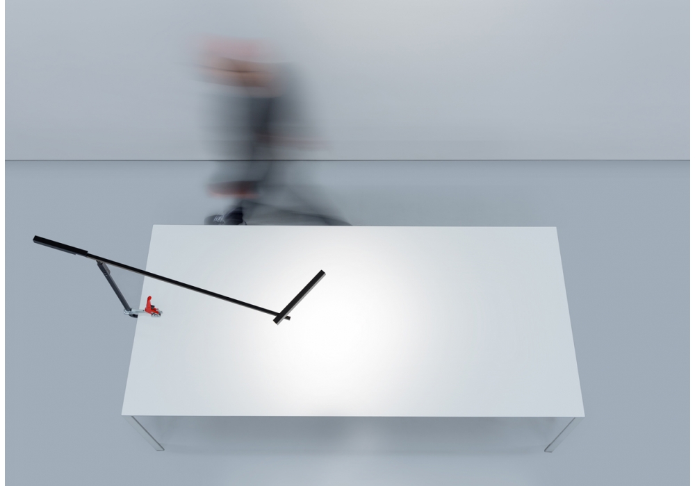 Morsetto designed and produced by Davide Groppi is a table lamp structured by two movable arms in matt black painted metal. The articulated head adopts a dimmable LED light source in different gradations of light. The base is made up of a workshop clamp which gives the possibility of anchoring it firmly to a fixing point.