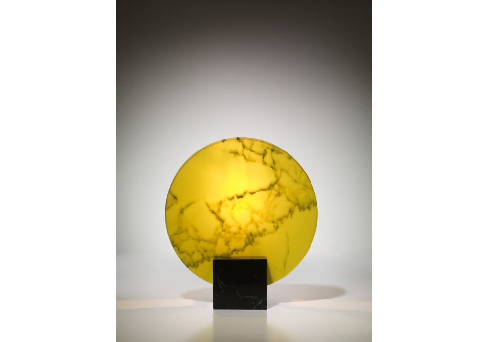 Acid Marble designed by Lee Broom is a table lamp with a layer of white carrara marble and acid yellow tinted glass, sandwiched together to form an illuminated circular diffuser. Set into a solid black nero marquina marble base, the veins of the carrara marble are visible through the glass allowing the marble to appear yellow, giving this very classic material a playful twist.
