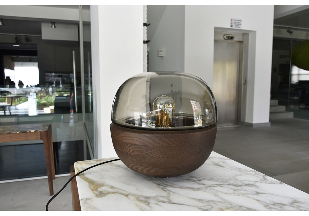 Bolla designed by C. Favaretto for Porada is a table lamp with base in solid ash or matt lacquered open pore and diffuser in white opal or smoked glass.