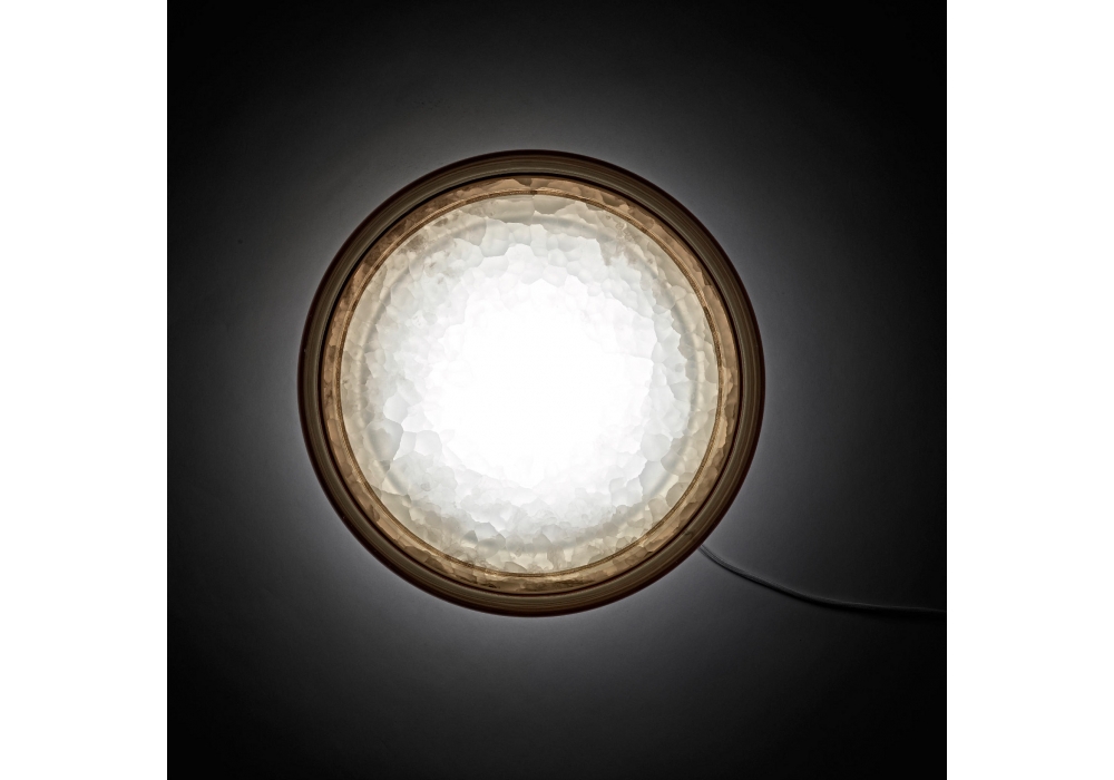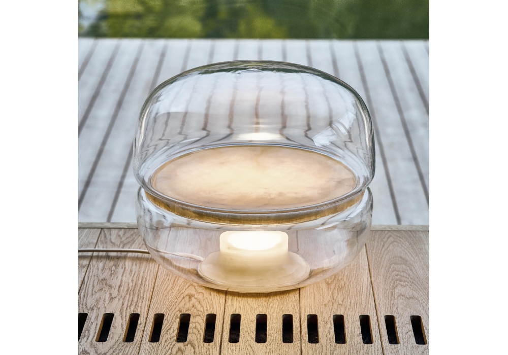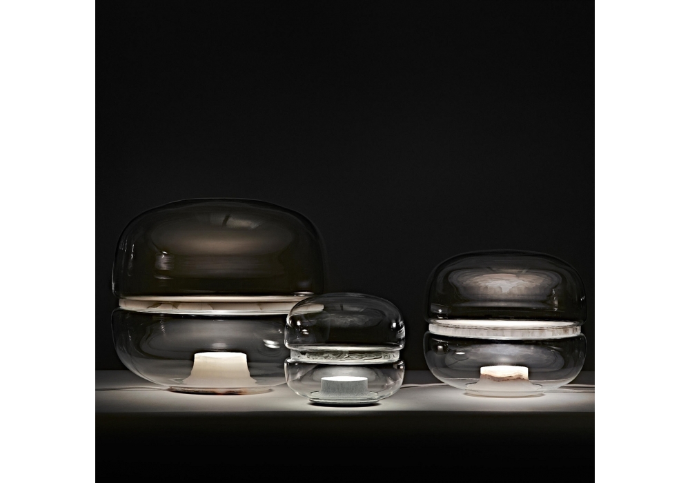 Macaron designed by Lucie Koldová for Brokis is a table lamp with a diffuser in transparent shiny glass in various finishes, inside there is a disc made of glass or onyx. Circular base in orvere wood or onyx. Textile fiber case equipped with manual dimmer.