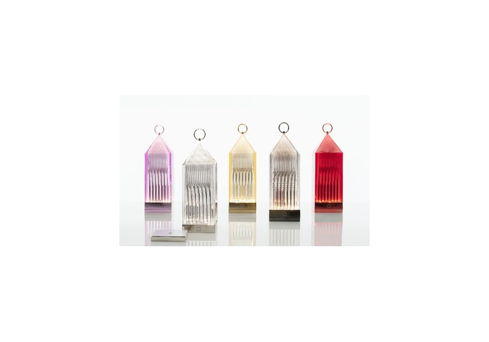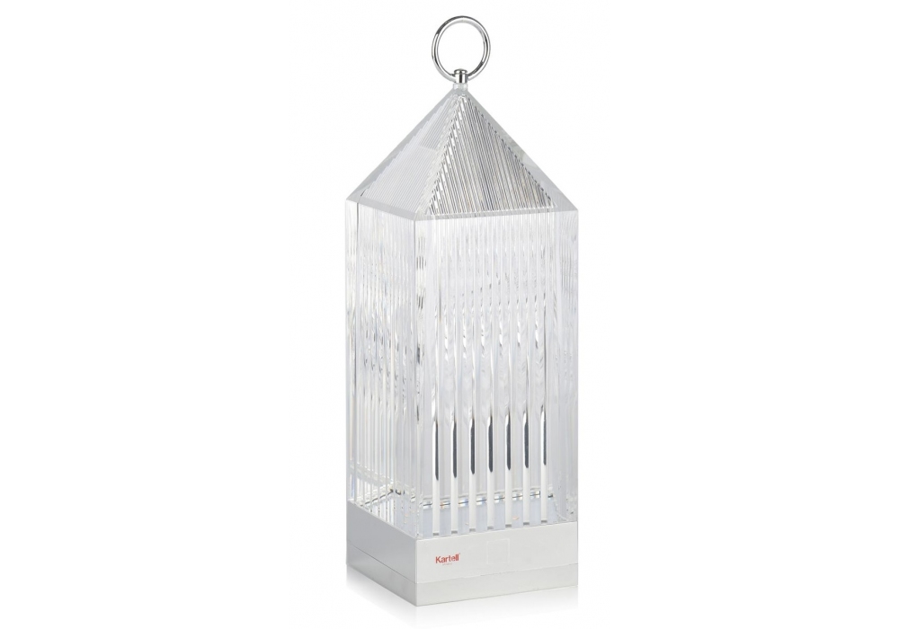 Lantern designed by Fabio Novembre for Kartell is an original portable LED table lamp, transparent, "chargeable", injection moulded lamp that charges by placing it onto a charging base. The light is projected by a graphic effect of the design.