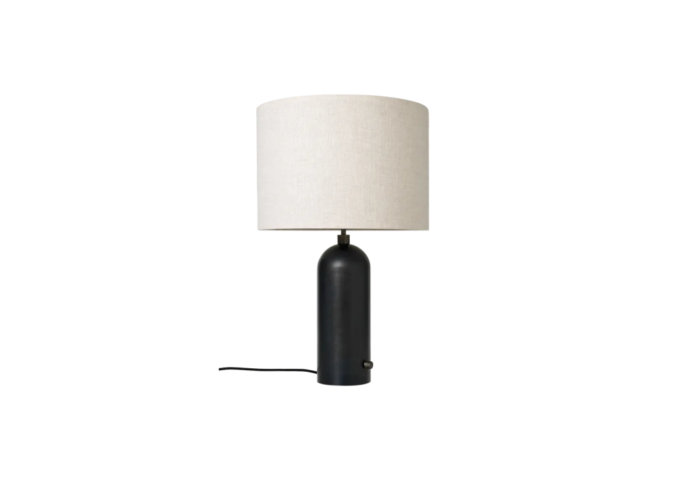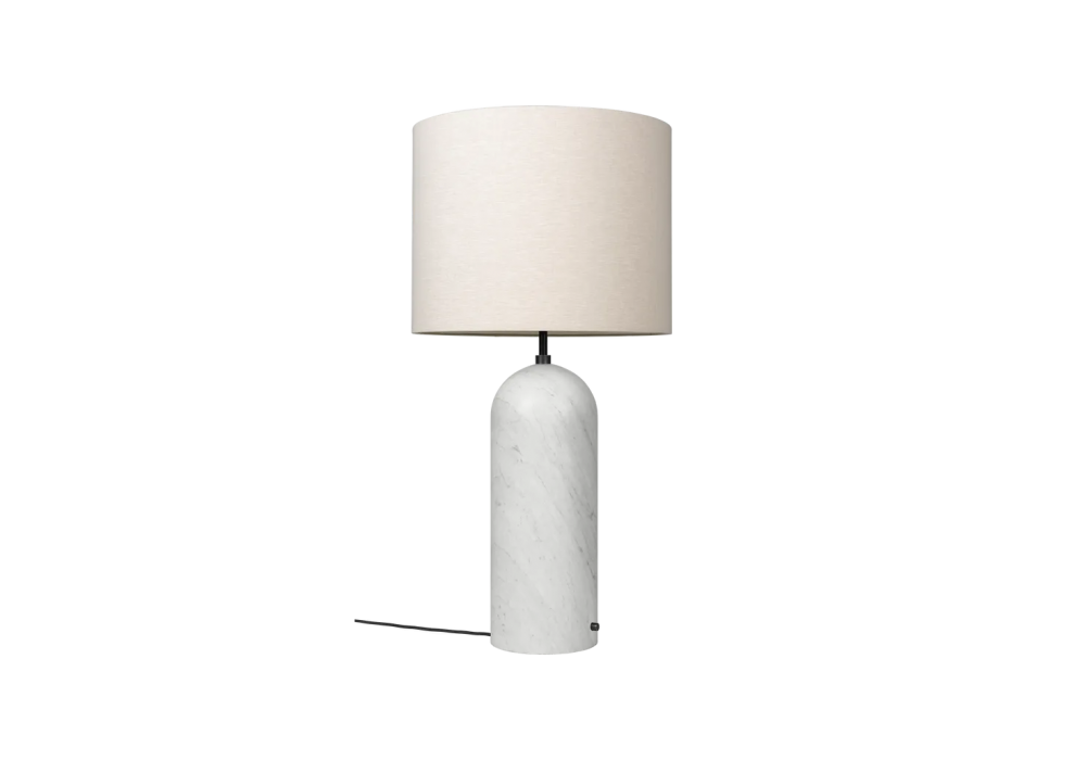 Gravity designed by Space Copenhagen for Gubi is a table lamp with base in black marble, gray marble or steel and white or canvas lampshade. Available in two dimensions. Light dimmer on base. Bulb not included.