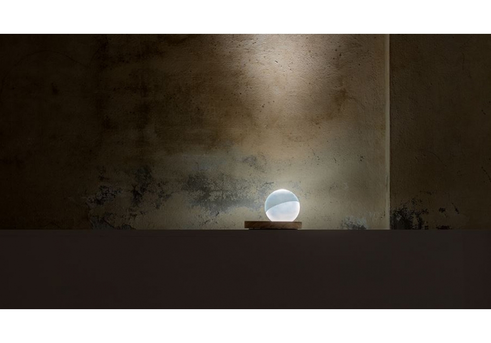 Pigreco designed by Omar Carraglia for Davide Groppi is a table lamp characterized by a circular wooden base on which a glass sphere is positioned. The spherical diffuser is made of half-frosted glass and shields a LED-type light source with dimmer system on the power cord.