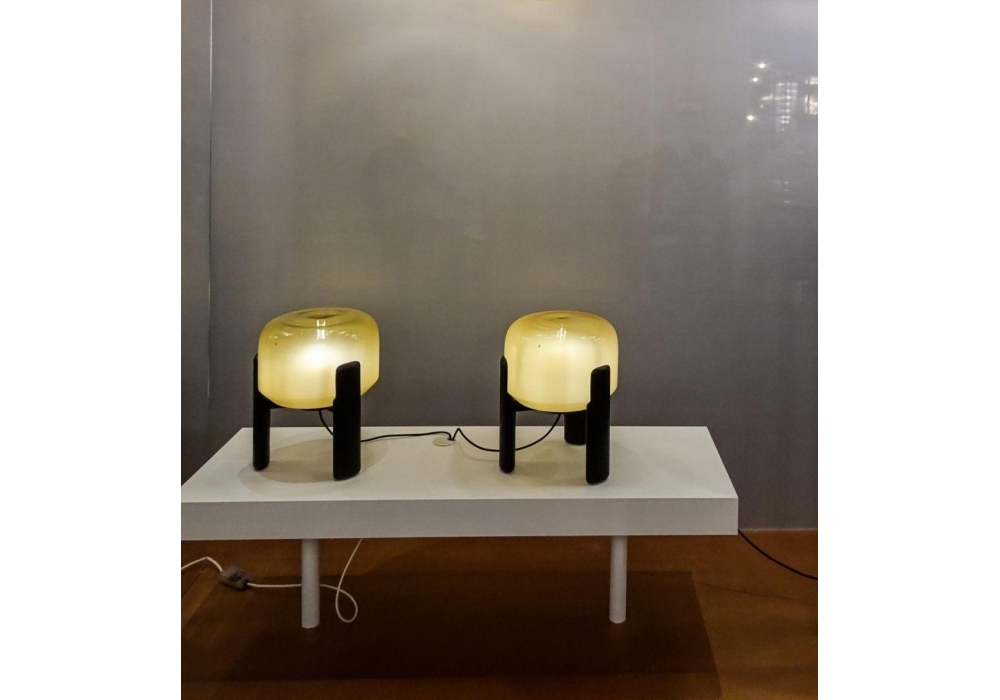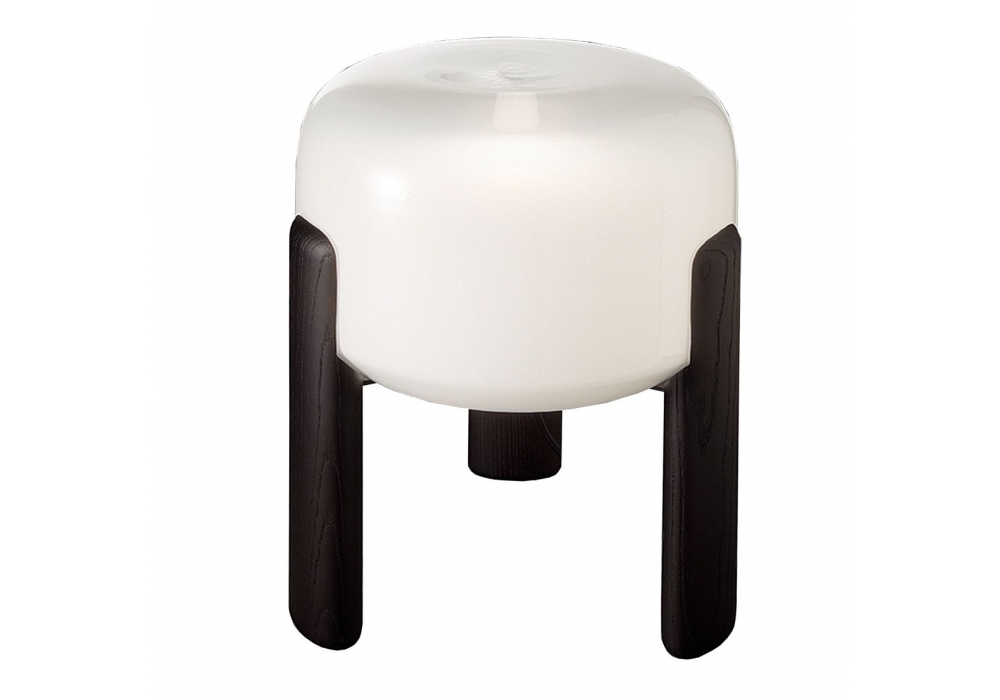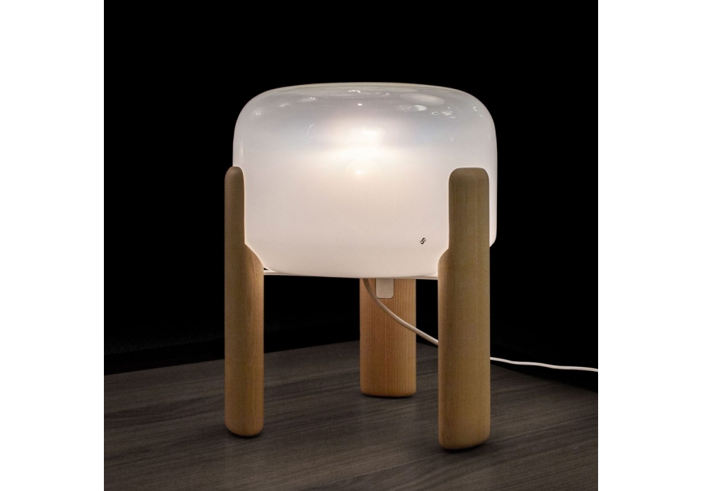 Sata designed by Favaretto & Partners for Vistosi is a table lamp with legs and structure in ash wood. The diffuser is in opal white glass and shields a LED or halogen light source with E27 socket. Sata is available in different finishes.