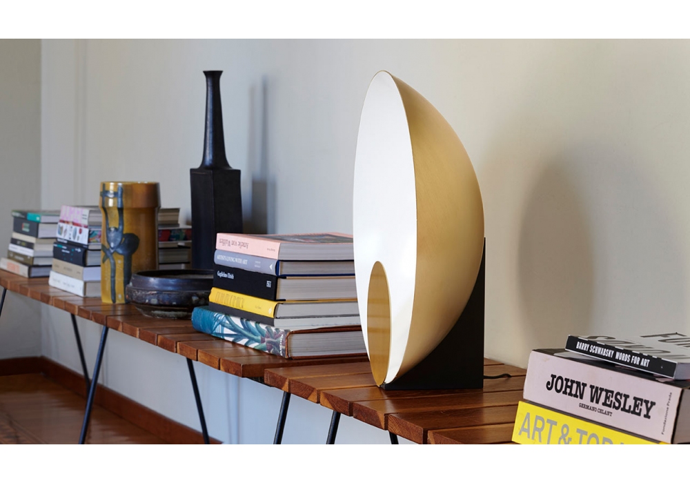 Siro designed by Marta Perla for Oluce is a circular table lamp with black painted metal base. The diffuser is in enamelled aluminum and screens a dimmable LED light source. Siro is available in different finishes and sizes.