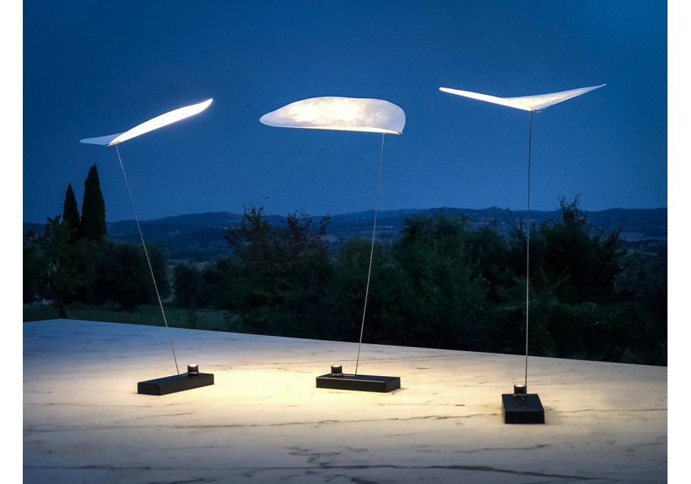 Koyoo designed by Axel Schmid for Ingo Maurer is a LED table lamp with a wire rope spring. The light source is integrated in the foot and perfectly illuminates the diffuser circle.
