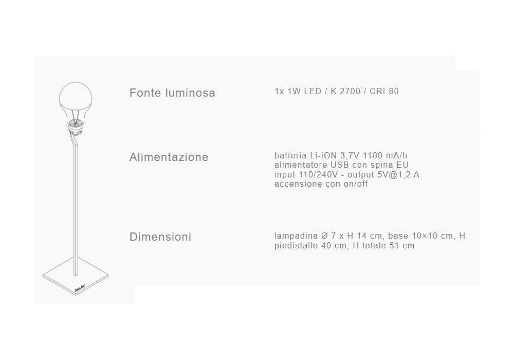 | Dimensions | bulb Ø 7 x H 14 cm, base 10 × 10 cm, H pedestal 40 cm, total H 51 cm |