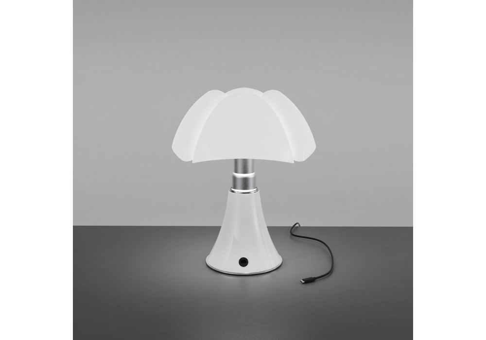 Minipipistrello Cordless designed by Gae Aulenti for Martinelli Luce is a portable and rechargeable table lamp with touch sensor. The central telescopic arm is in stainless steel with a circular support in painted metal. The diffuser is in white opal methacrylate and screens a dimmable integrated LED light source. Minipipistrello Cordless is available in different finishes.