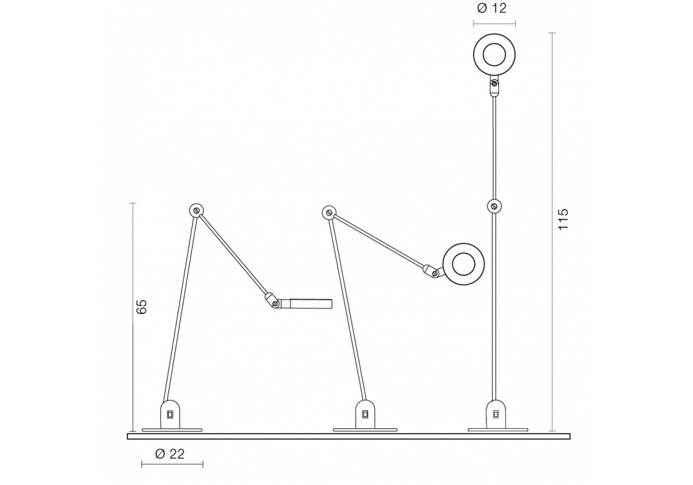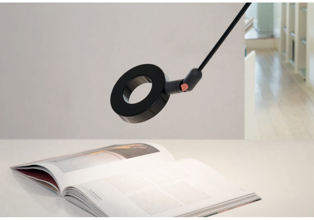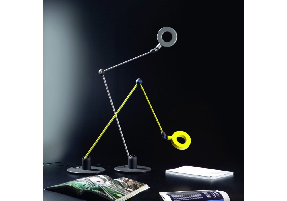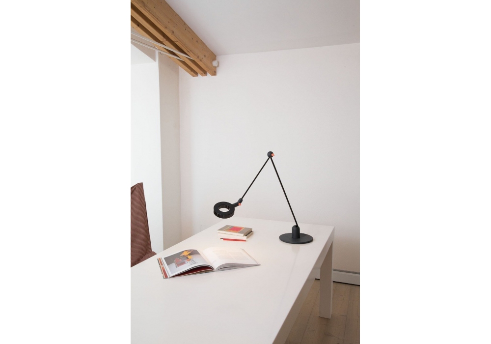 L'amica designed by Elio and Emiliana Martinelli for Martinelli luce is a table lamp with circular base in metal and anthracite-colored resin. The articulated arms are in metal with anthracite colored resin joints. The head is adjustable in painted aluminum and houses a double intensity LED light source. The friend is available in different finishes.