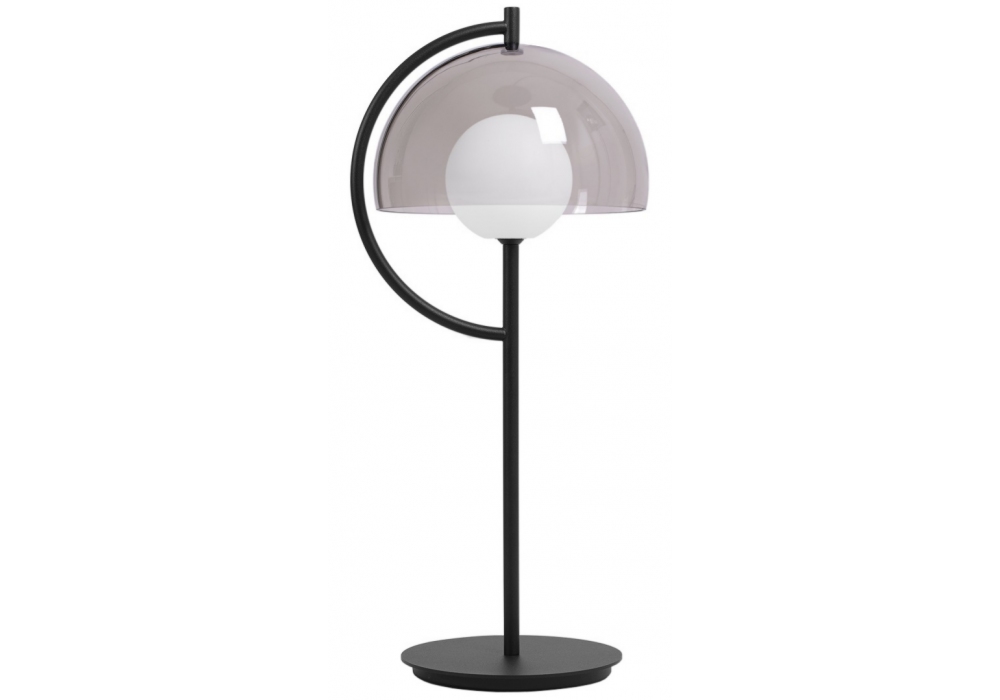 Hood designed by Andreas Kowalewski for Ligne Roset is a LED table lamp with base and structure in satin black structured epoxy lacquered steel, RAL 9005. Spherical diffuser in blown opal glass. Hemispherical lampshade in transparent grey hand-blown glass. Electric cable in black fabric.