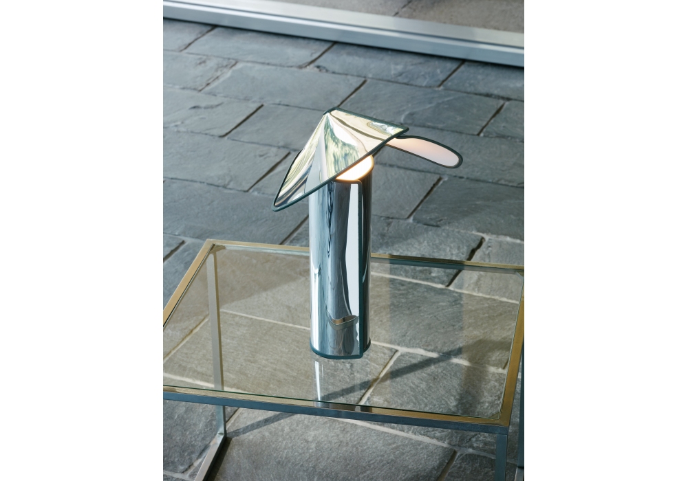 Chiara designed by Mario Bellini for Flos is a table lamp composed of an aluminum reflector body, internally coated with a matt white plastic film, folded and closed with stainless steel hooks riveted to the sheet metal. A colored molded rubber gasket is applied to the entire profile of the body. The internal base in extruded aluminum gives stability to the body that is fixed on it and supports the lamp holder. A dimmer is mounted on the power cable for the progressive regulation of light intensity. Bulb not included.