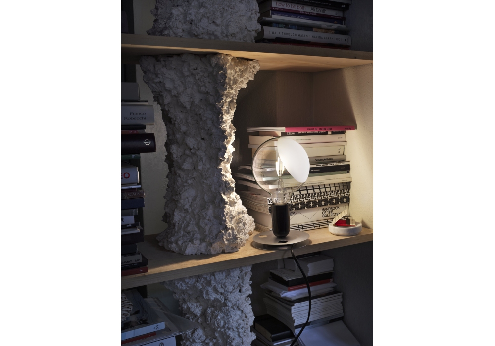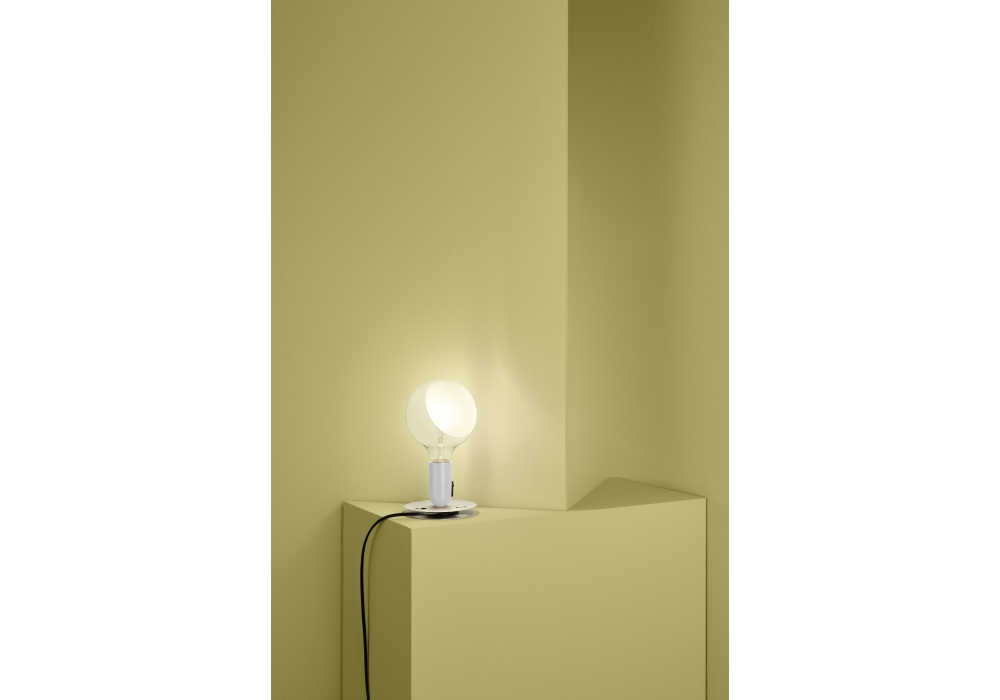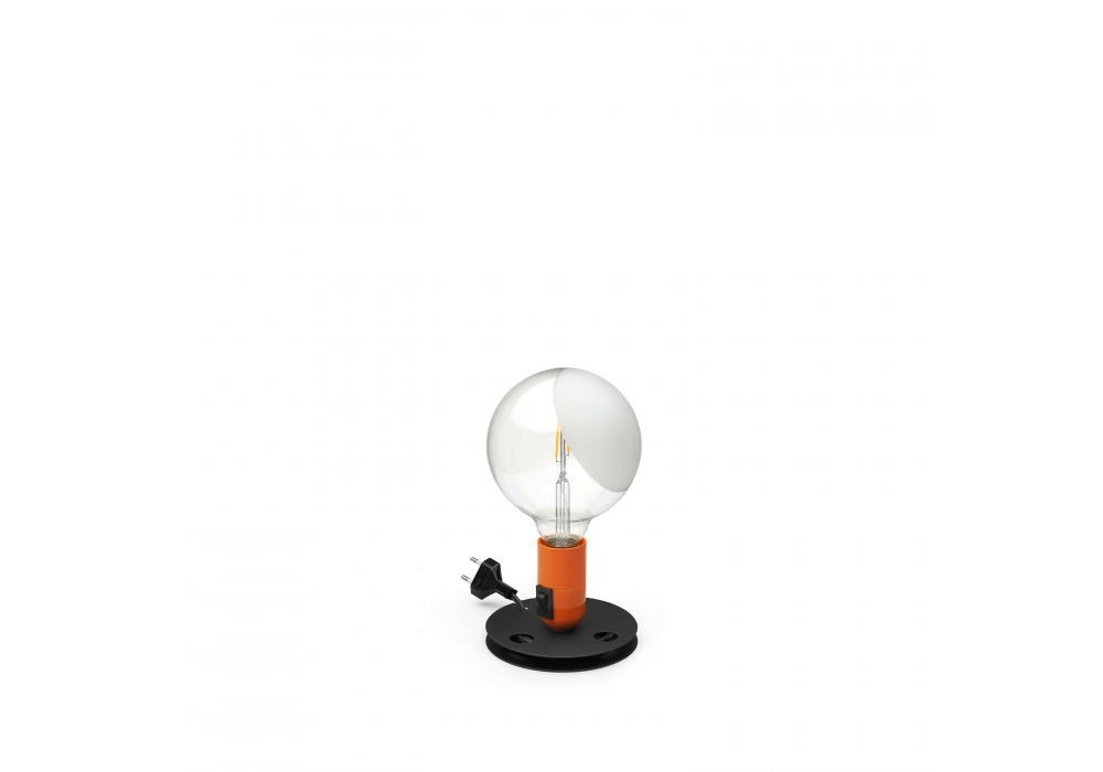 Lampadina designed by Achille Castiglioni for Flos is a table lamp with direct/diffused light. Base in anodized aluminum, also having the function of rewinding the electric cable. Bulb holder in Bakelite and, for the orange color, with liquid painting. Globolux bulb transparent glass with partial sandblasting on one side of the sphere. Integrated switch (not adjustable). Light source included.