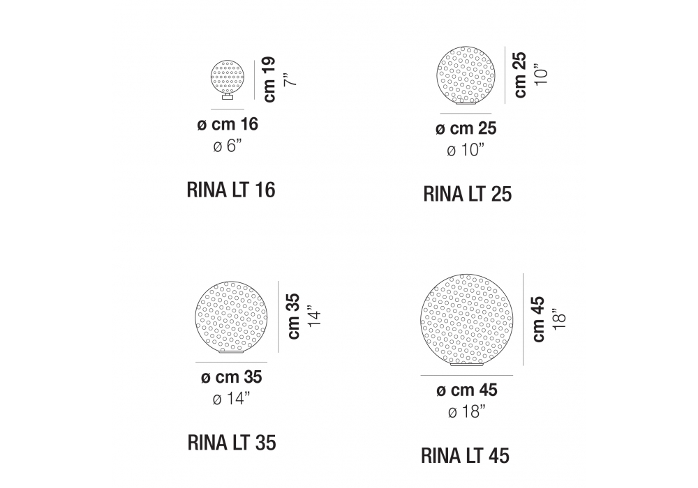| Dimensions | Ø 16 x H 19 cm; Ø 25 x H 25 cm; Ø 35 x H 35 cm; Ø 45 x H 45 cm. |