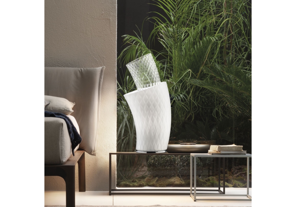 Assiba designed by Mauro Olivieri for Vistosi is a table lamp with circular base in polished chrome colored metal. The diffuser is made of glass with a textured surface and shields a LED or halogen light source with E27 fitting. Assiba is available in different finishes.