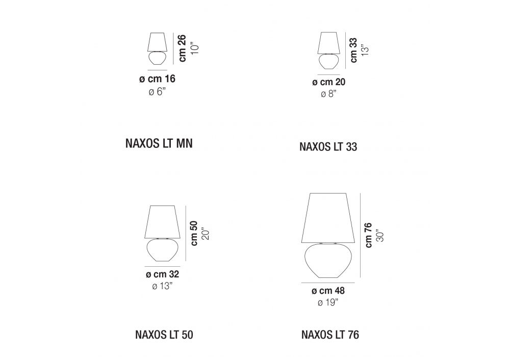 | Dimensions | Ø 16 x H 26 cm; Ø 20 x H 33 cm; Ø 32 x H 50 cm; Ø 48 x H 76 cm. |