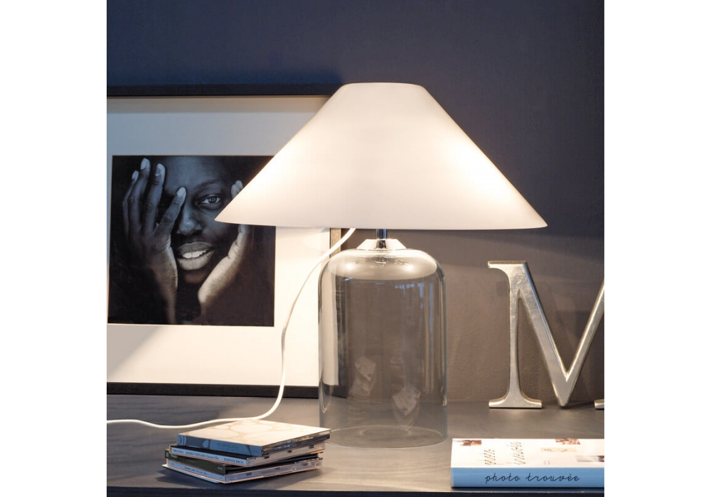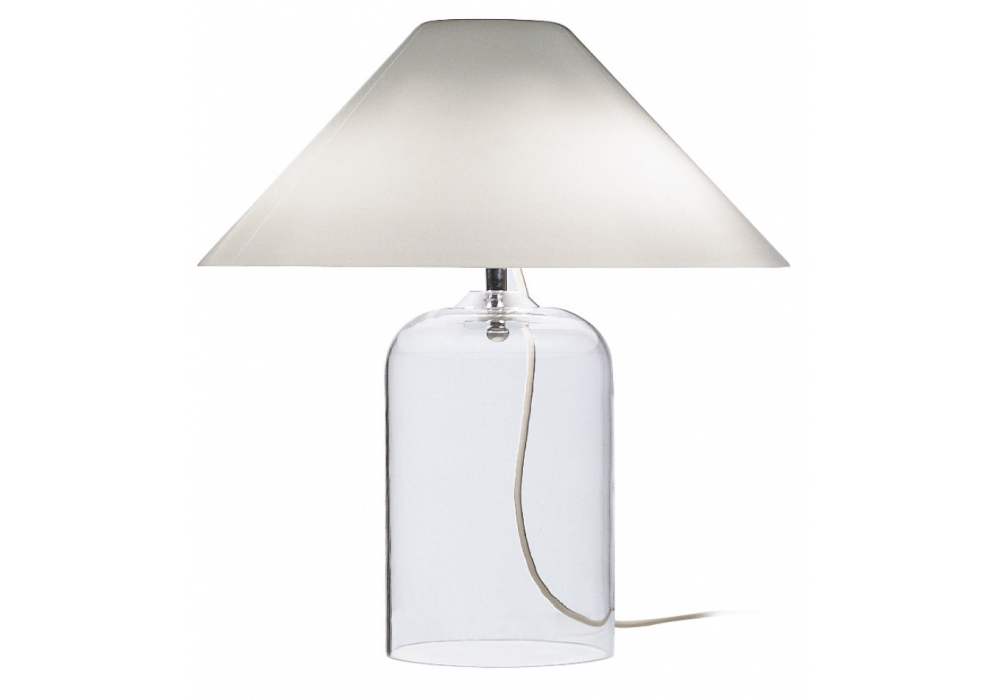 Alega designed by Vico Magistretti for Vistosi is a table lamp with structure and cylindrical base made of transparent glass and chromed metal parts. The conical lampshade is in glossy white blown glass and adopts a LED or halogen light source with E14 fitting.