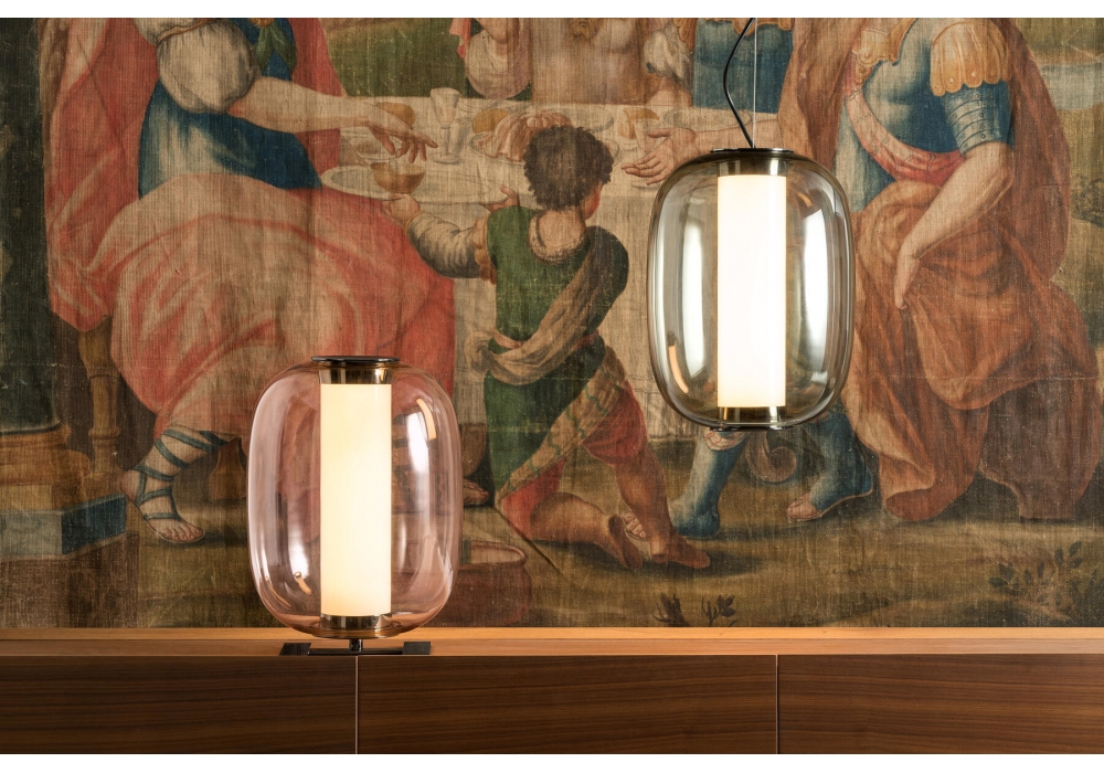 Meridiano designed by Gabriele and Oscar Buratti for Fontana Arte is a table lamp, with supporting structure in nickel-plated metal and circular base. The diffuser is ellipsoidal in blown glass while the internal one is in pyrex glass painted in three different finishes: smoked, pink or transparent. The light source used is a dimmable LED type (included).