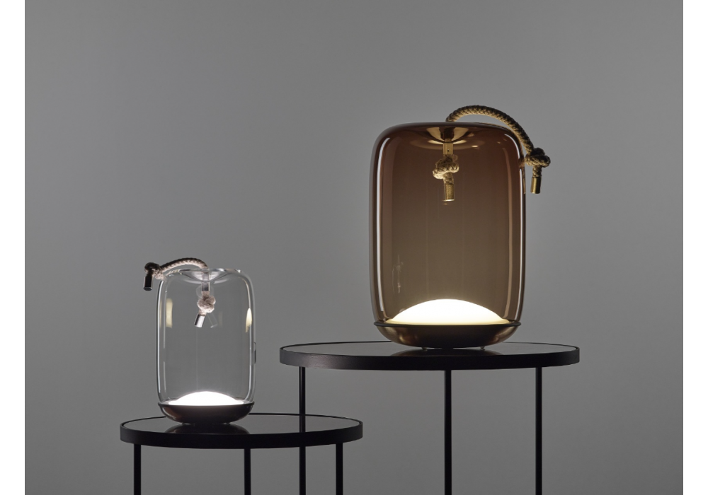 Knot Battery designed by Chiaramonte Marin for Brokis is a portable table lamp with a circular metal base in various finishes. The diffuser is cylindrical in blown glass with internal and external surfaces to choose between glossy or opaque. The light source used is LED with touch dimmer. Black USB power cable.