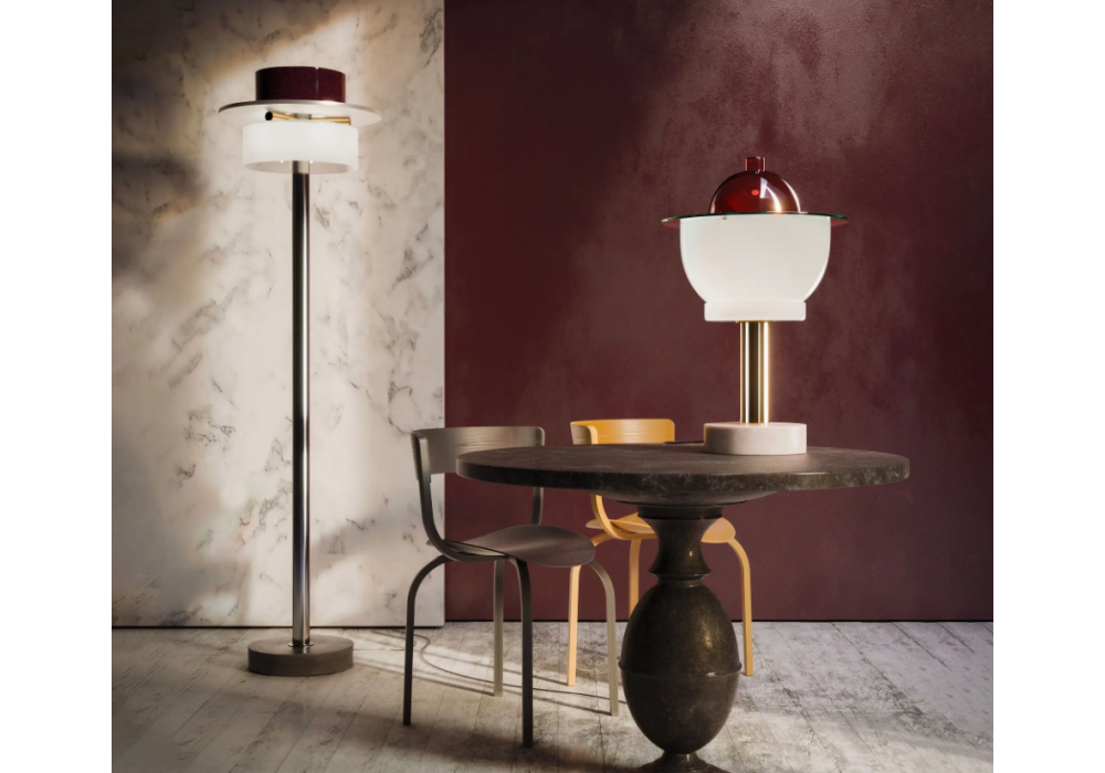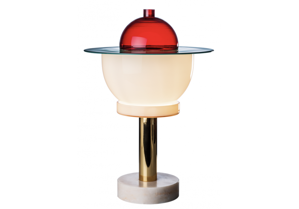 Nopuram designed by Ettore Sottsass for Venini is a dimmable LED table lamp with blown glass diffuser in pink, red and green colors. The base is in marble and the structure in golden metal. Edition numbered by year.