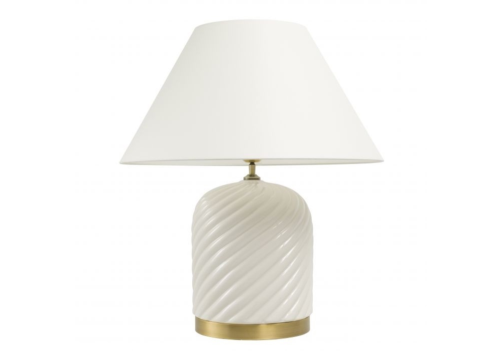 Table Lamp Savona designed by Eichholtz is a table lamp with a ceramic base with a spiral motif in relief. base with antique brass finish and a simple cream-colored lampshade.
