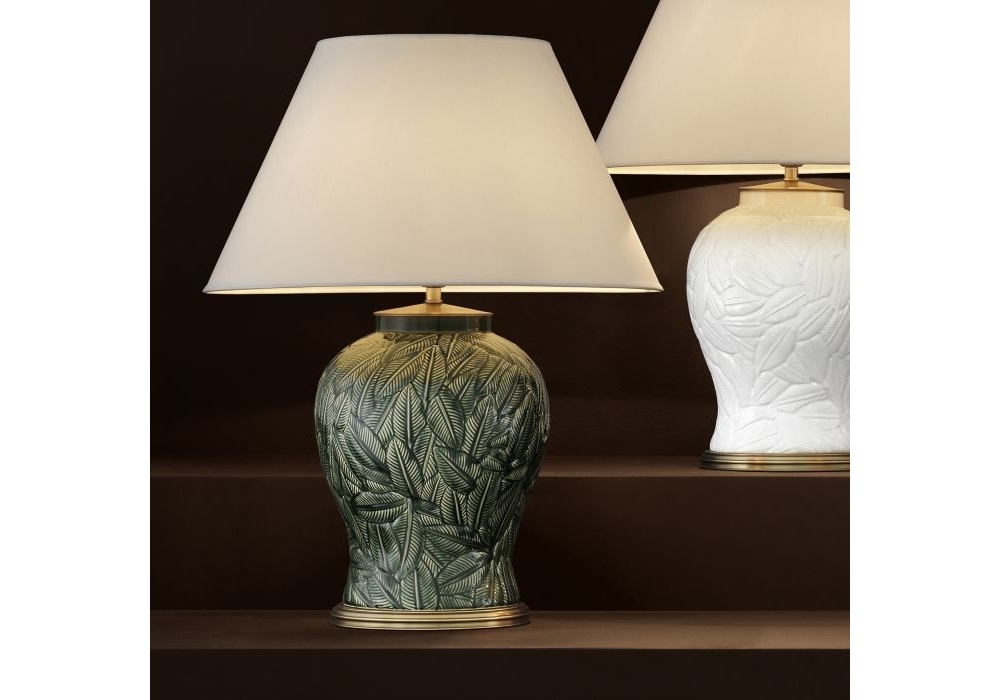 Table Lamp Cyprus designed by Eichholtz is a table lamp with green ceramic base. It features a beautiful raised leaf pattern and a wavy edge with an antique brass finish. It is equipped with an ivory shade. Available in 2 finishes