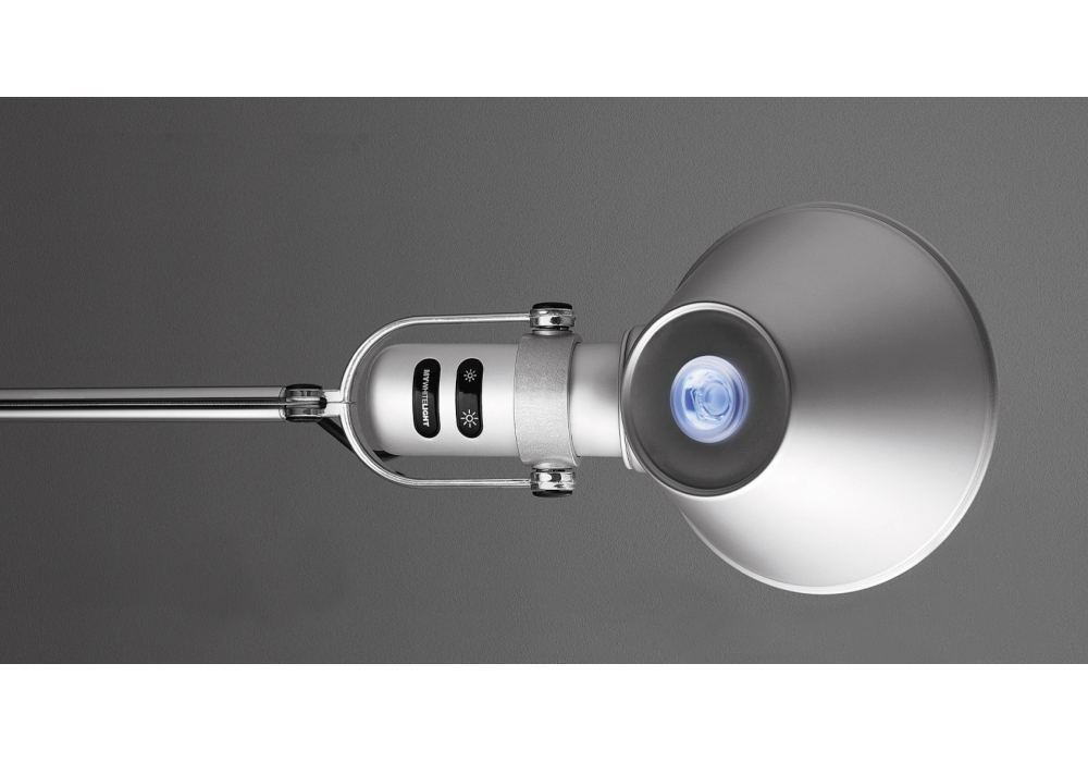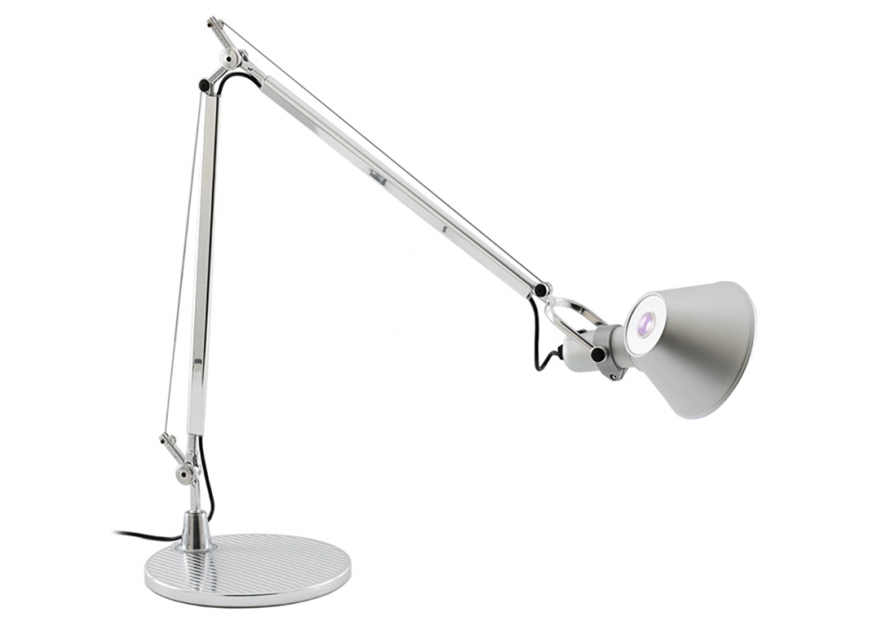 Tolomeo LED Pure Integralis designed by Michele De Lucchi & Giancarlo Fassina for Artemide. It is structured by the combination of aluminum and steel with two movable arms and an adjustable head. The light source adopted is a dimmable LED type with a sanitization system managed via the Artemide app. Tolomeo LED Pure Integralis is available in three versions: with circular support base, with clamp or with fixed pin.