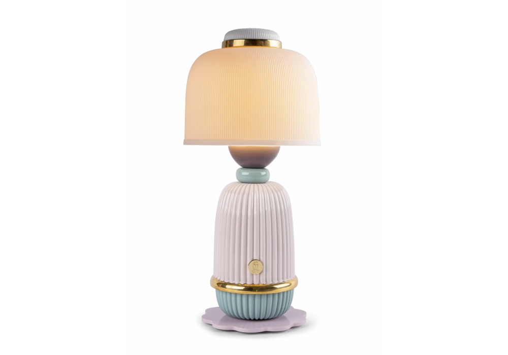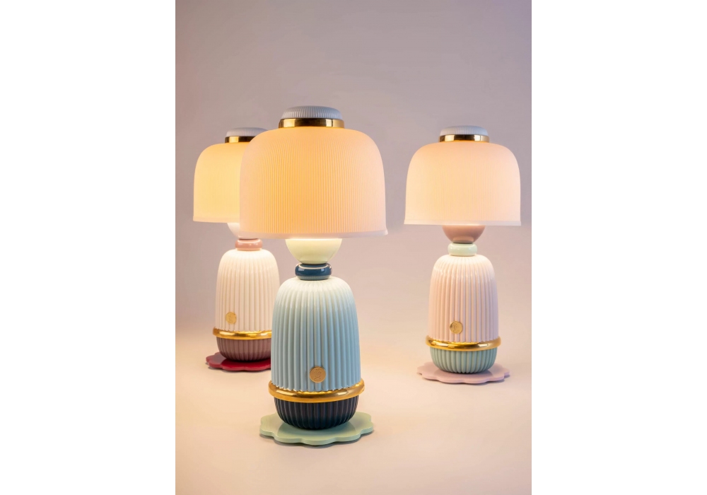 Kokeshi designed by Robert Schnyder for Lladró It is a portable battery-operated table lamp. The lamp body is made of glossy porcelain and is available in different finishes, while the lampshade is tulip-shaped in opaque porcelain.