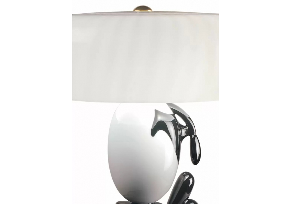 Hairstyle sculpted by Dept. Diseño y Decoración and designed by Hisakazu Shimizu for Lladró is a table lamp with a circular base in black lacquered wood. The lamp body is made of black and white porcelain with gold details, while the lampshade is in blown Murano glass. Hairstyle is available in different models and sizes.