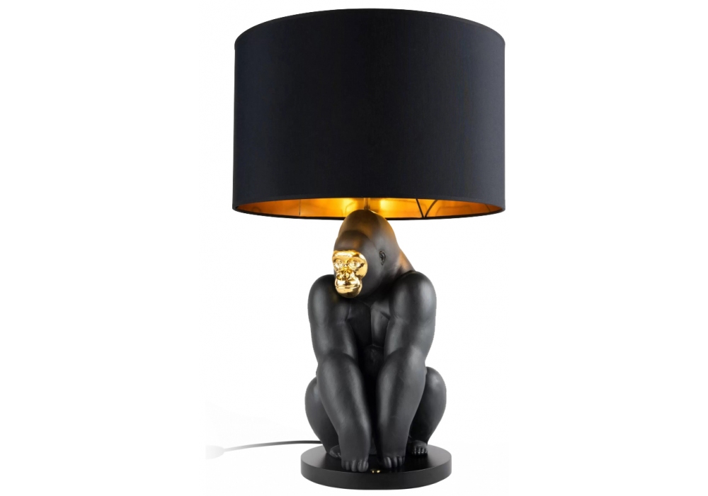 Gorilla sculpted by Marco Antonio Noguerón and designed by Robert Schnyder for Lladró is a table lamp with a circular base in matt black porcelain. The lamp body is made of black porcelain with gold details, while the lampshade is in black fabric with gold-colored interior.