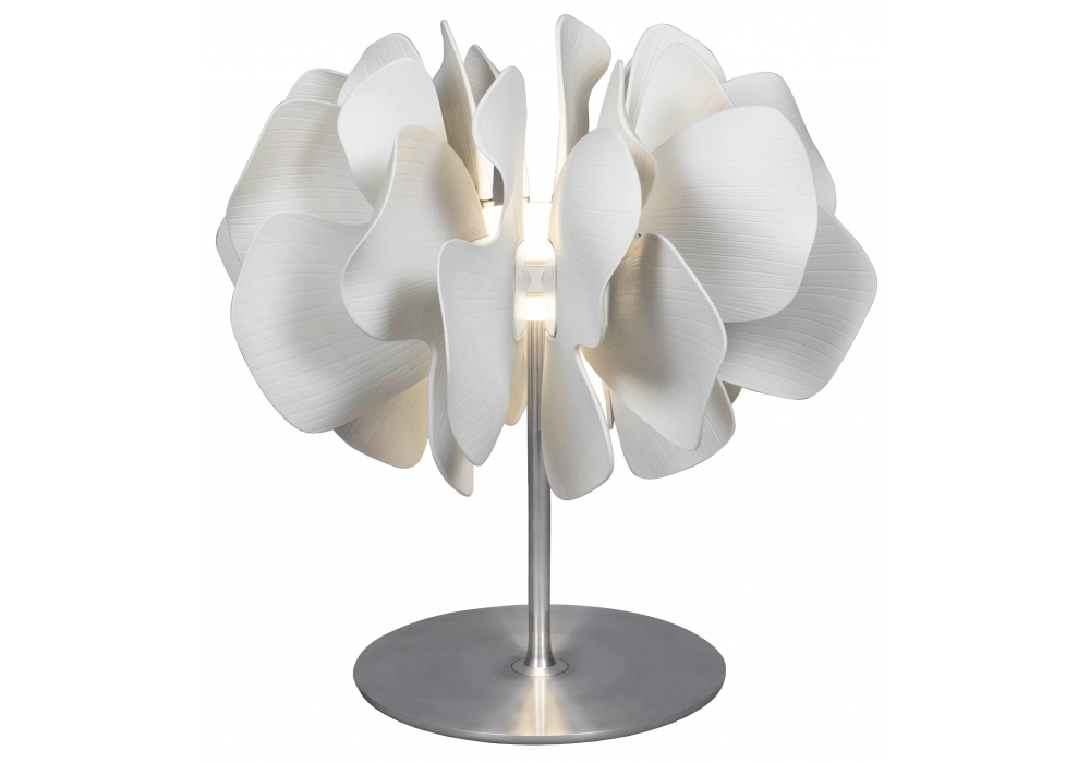 Nightbloom sculpted by Dept. Diseño y Decoración and designed by Marcel Wanders for Lladró is a table lamp with circular base and tubular metal supporting structure. The diffusing body is made up of a set of handmade porcelain petals. Nightbloom is available in different finishes.