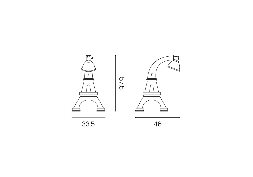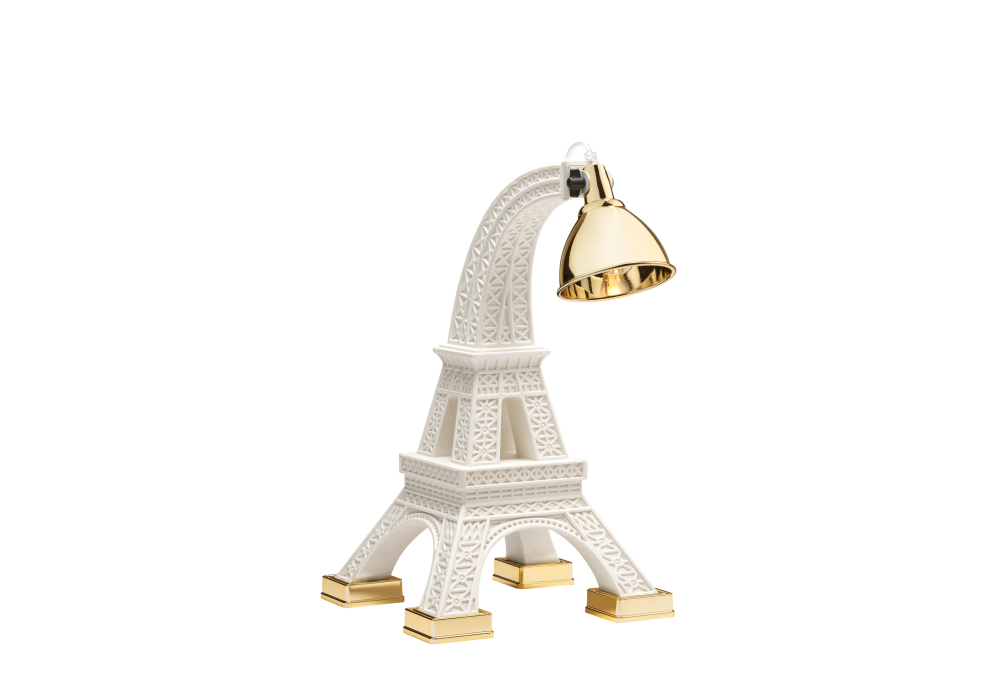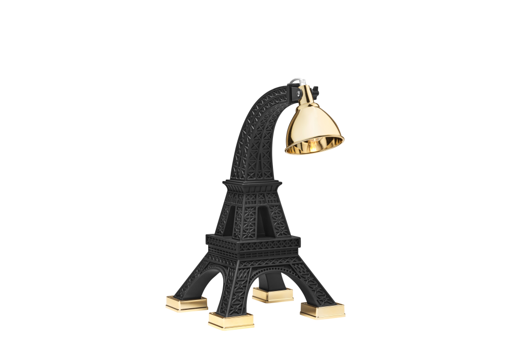 Paris M designed by Studio Job for Qeeboo is a table lamp in metal and polyethylene painted in black or white with brass details. The diffuser has an adjustable brass dome shape.